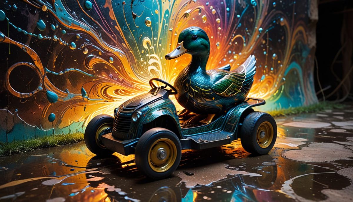 This image shows a duck joyfully eating spaghetti atop a speeding lawnmower. The scene is rendered in a tribal petroglyph style with psychedelic distortions and shifting prismatic light.