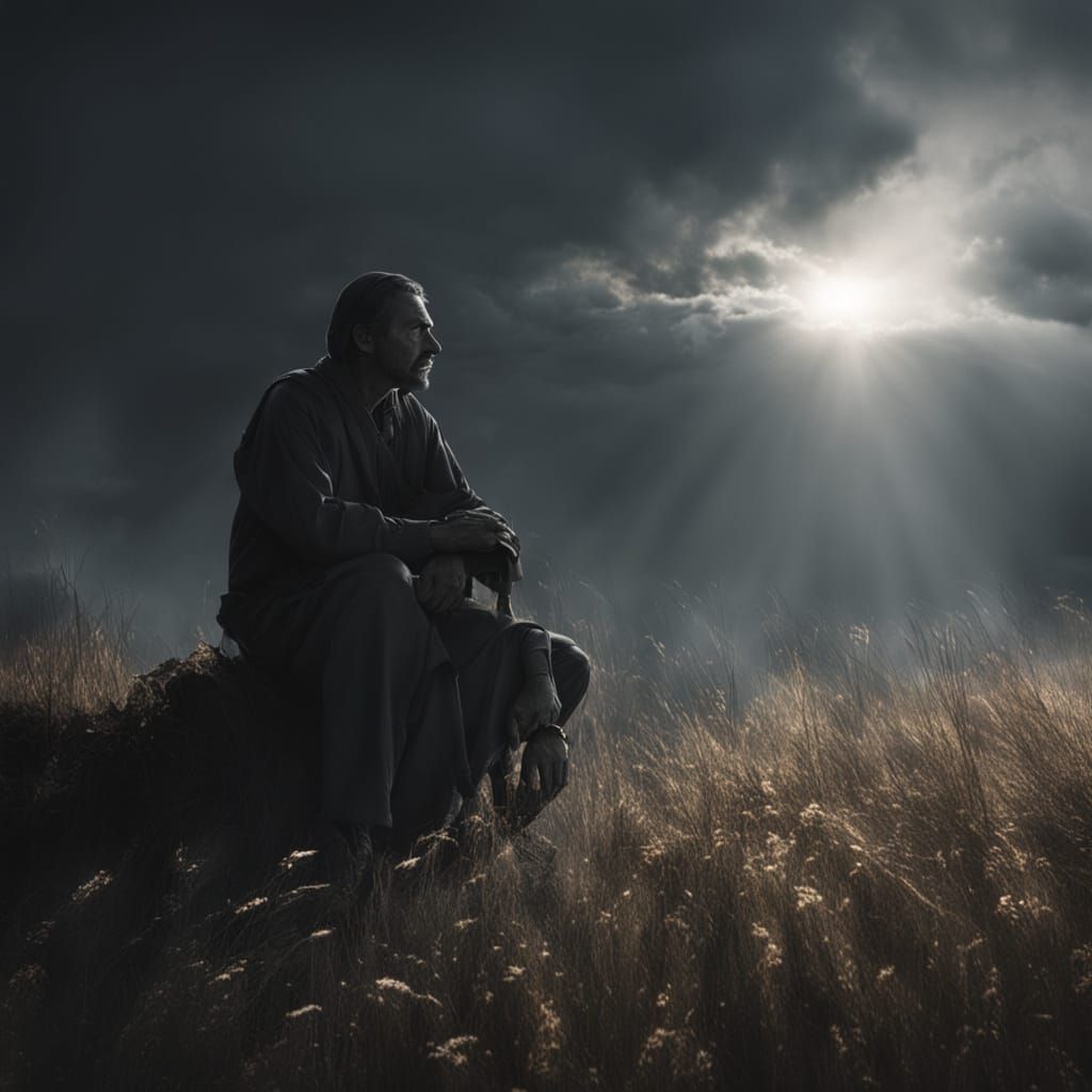 A poignant image shows a sorrowful angel gazing down at humanity from a mountaintop. Soft lighting and shadows create a cinematic, atmospheric effect with a hyperrealistic aesthetic.