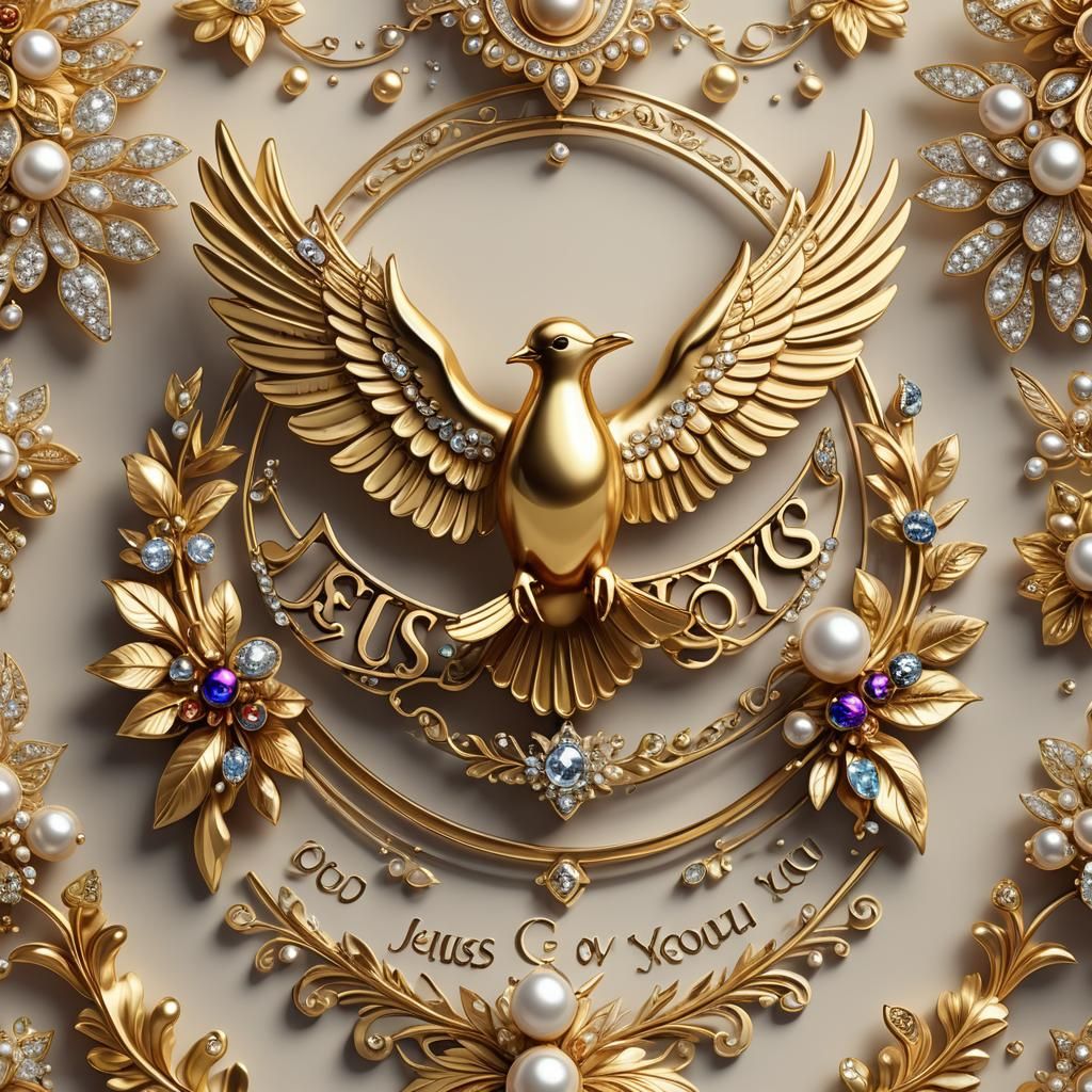 This image shows a 3D logo of a golden dove with jeweled wings. Below the dove is elegant gold script reading 'Jesus Loves You.' The artwork features warm lighting and opulent details.