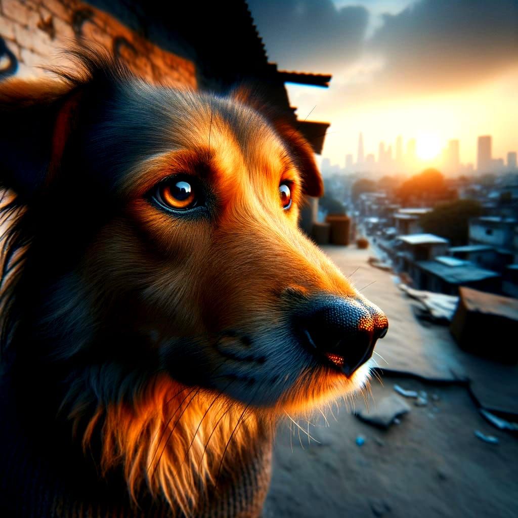 This hyperrealistic photo captures a street dog's soulful eyes as it basks in the golden light of sunset. Moody cityscape background enhances the quiet resilience and cinematic beauty of the scene.