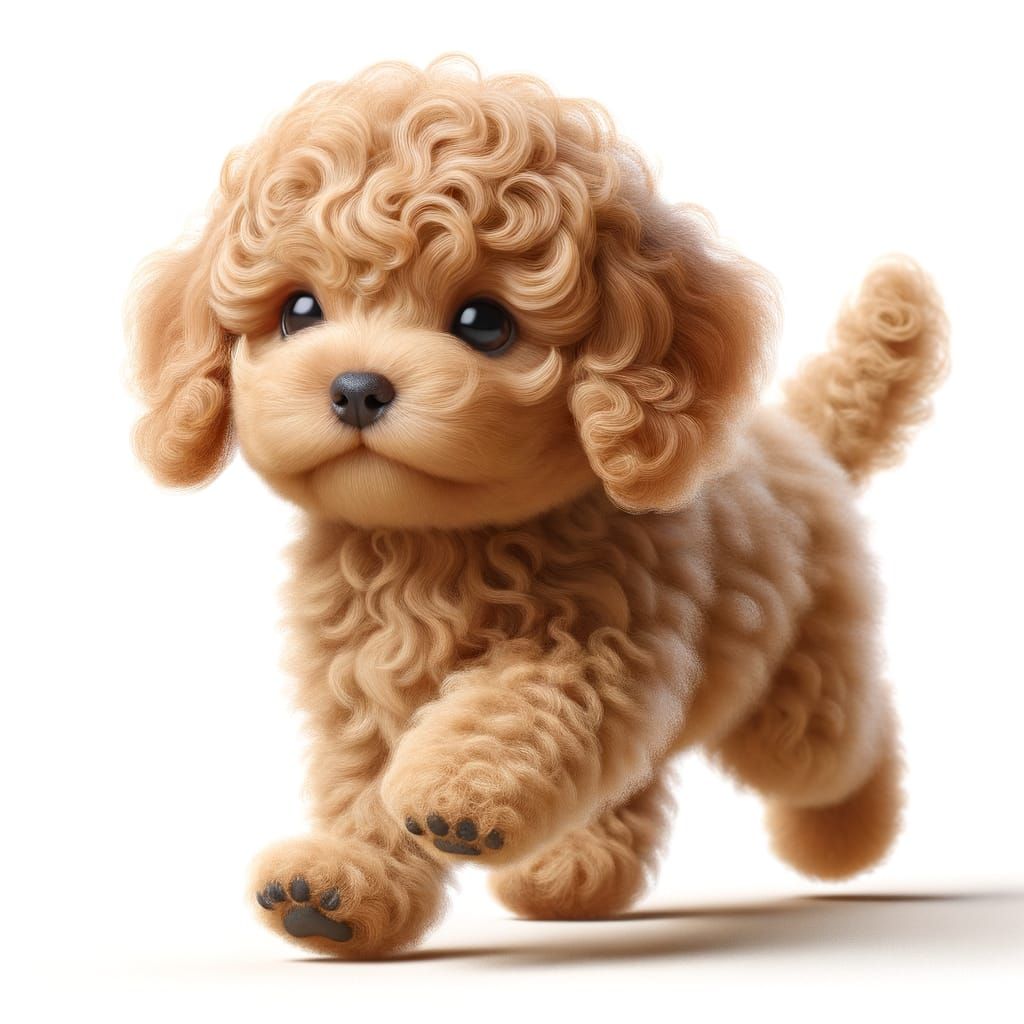 This image shows a small golden poodle with a wavy, curly coat, walking on its hind legs. The realistic artwork features a dog with no claws.