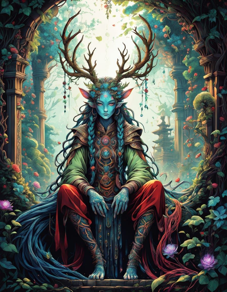 This detailed pointillism artwork depicts a charismatic fantasy hybrid creature with tribal tattoos and antlers, standing in a vine-covered temple with bioluminescent flowers. Ethereal lighting enhances the vivid colors and surreal elements.