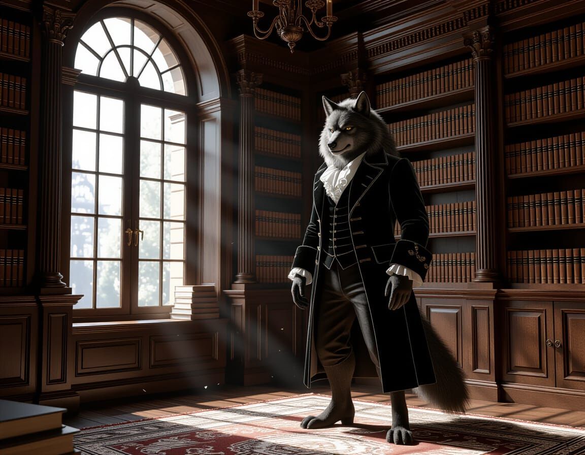 A majestic werewolf, adorned in a finely tailored velvet waistcoat, stands in a dimly lit, opulent library filled with ancient tomes. Moonlight streams through a grand arched window, illuminating dust motes dancing in the air. The scene is rendered with ultra-detailed textures on the fur and the rich ...
