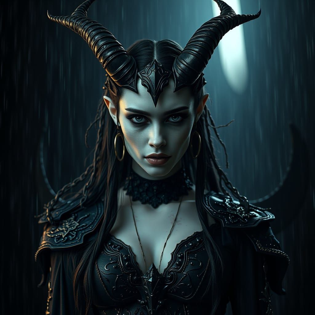 A striking picture of Lilith, a demon queen from Jewish folklore, with horns and a piercing gaze. The scene is set against a dark, rainy background, rendered in a hyperrealistic cinematic style.