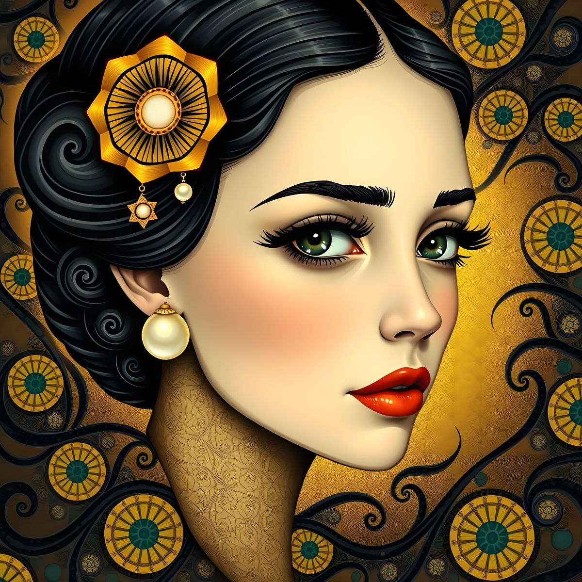A digitally rendered portrait of a girl with a pearl earring in the style of early 20th-century Art Nouveau. The artwork uses swirling geometric patterns, gold leaf, and a dreamy aesthetic.