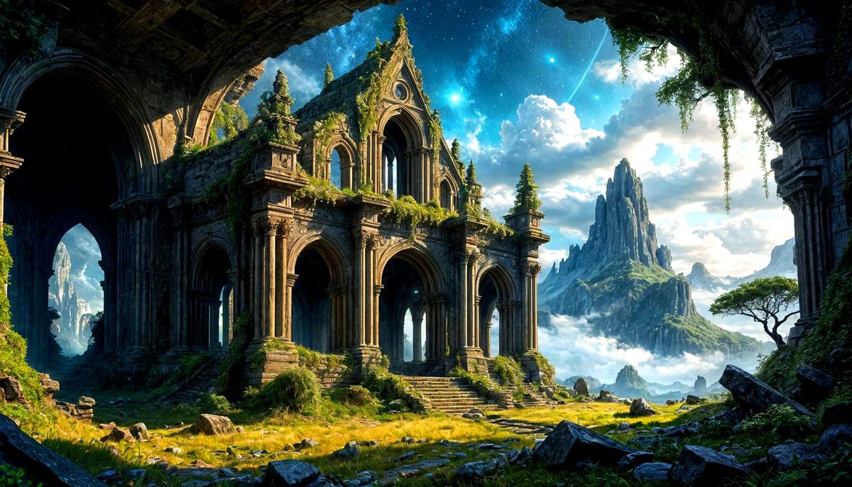 A striking picture of an old elven ruin under a vibrant, nebula-filled night sky. Luminous moss covers the crumbling stones. The scene is a hyper-realistic digital painting with a touch of cosmic surrealism.