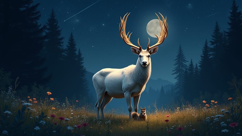 A majestic white stag with golden antlers stands frontal in a small dark forest clearing covered with flowers, illuminated by the moon. A squirrel sits on its back, holds a nut. It's night, with a full moon and a clear sky. The Milky Way is visible, and a shooting star flies by. ultra realistic