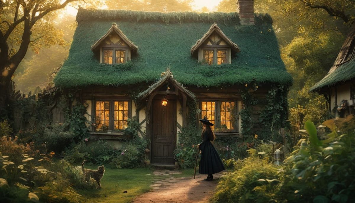 This enchanting image shows a young witch with striking blue-green eyes, surrounded by the charm of a whimsical folk art scene. She stands in front of a cozy cottage, adorned with intricate patterns and vibrant, earthy colors, amidst a serene atmosphere of magical realism.