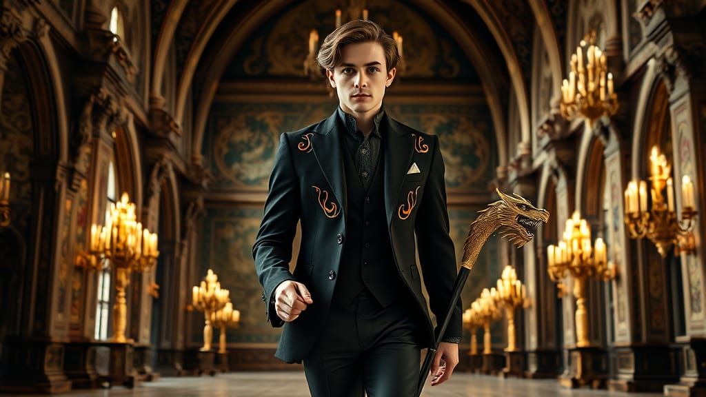 This image captures a dashing young man in a tailored black evening suit with flame-embroidered details, strutting down a grand catwalk in a medieval castle's great hall. The warm, golden color palette and cinematic style evoke a sense of high drama and opulence.