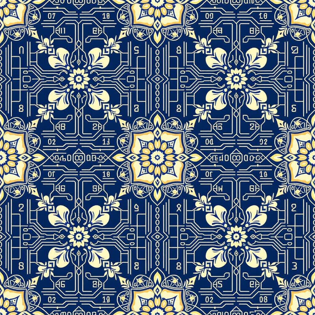 This image features a seamless pattern blending traditional Mexican textile art with digital elements like binary code and circuit boards, presented in a minimalist silver and gray palette.