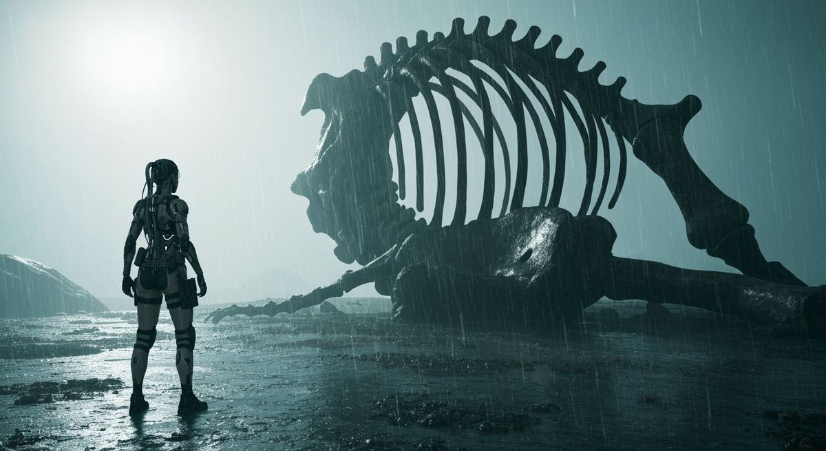 This highly detailed image shows a cyborg woman in tactical gear on a bleak alien planet, observing the skeletal remains of a massive, unknown creature. Captured in macro photography style with cyberpunk elements.