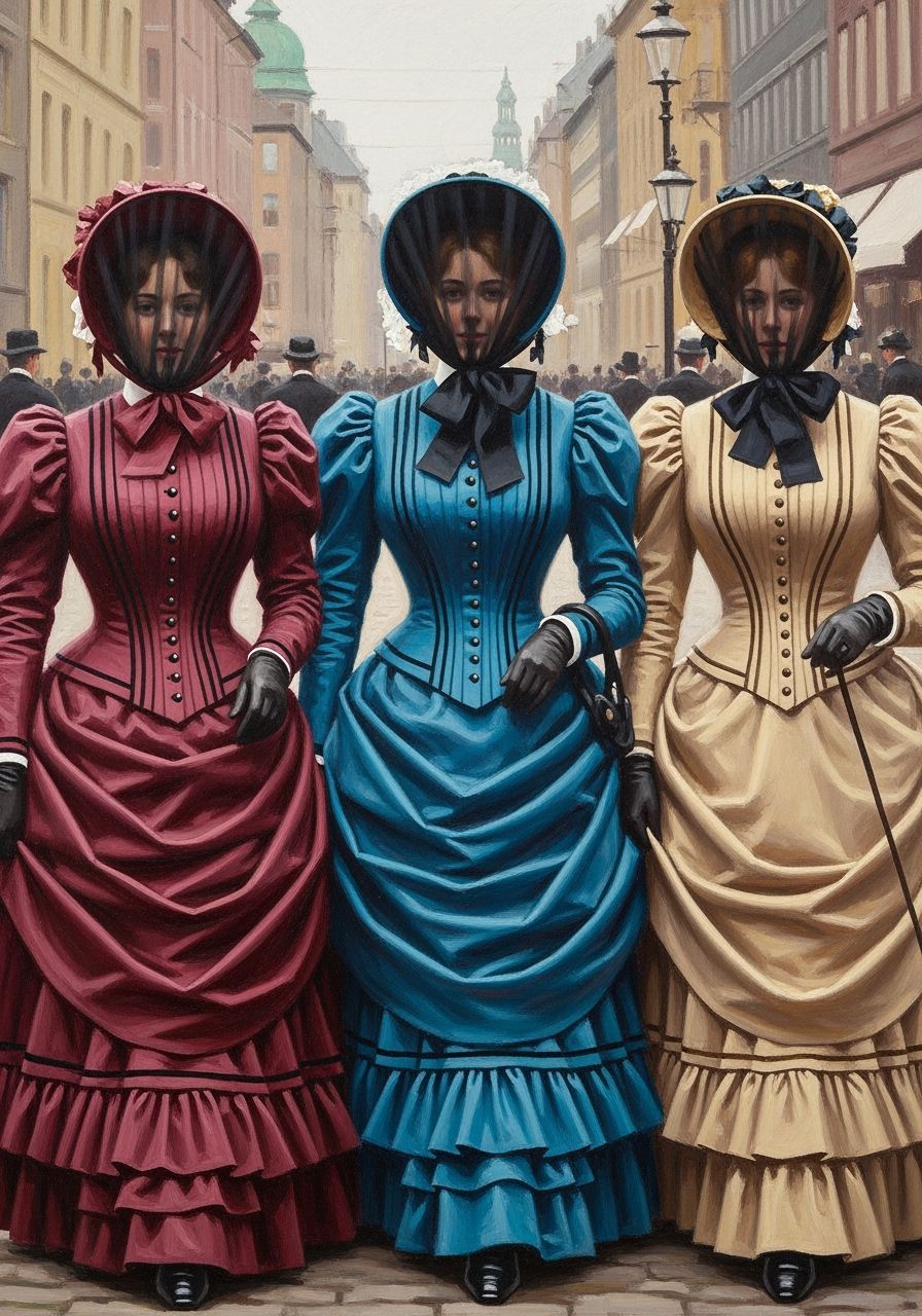 This image shows three curvy women in Victorian dresses walking in Copenhagen. The oil painting captures the interplay of light and shadow on their dresses and the urban environment with visible brushstrokes.