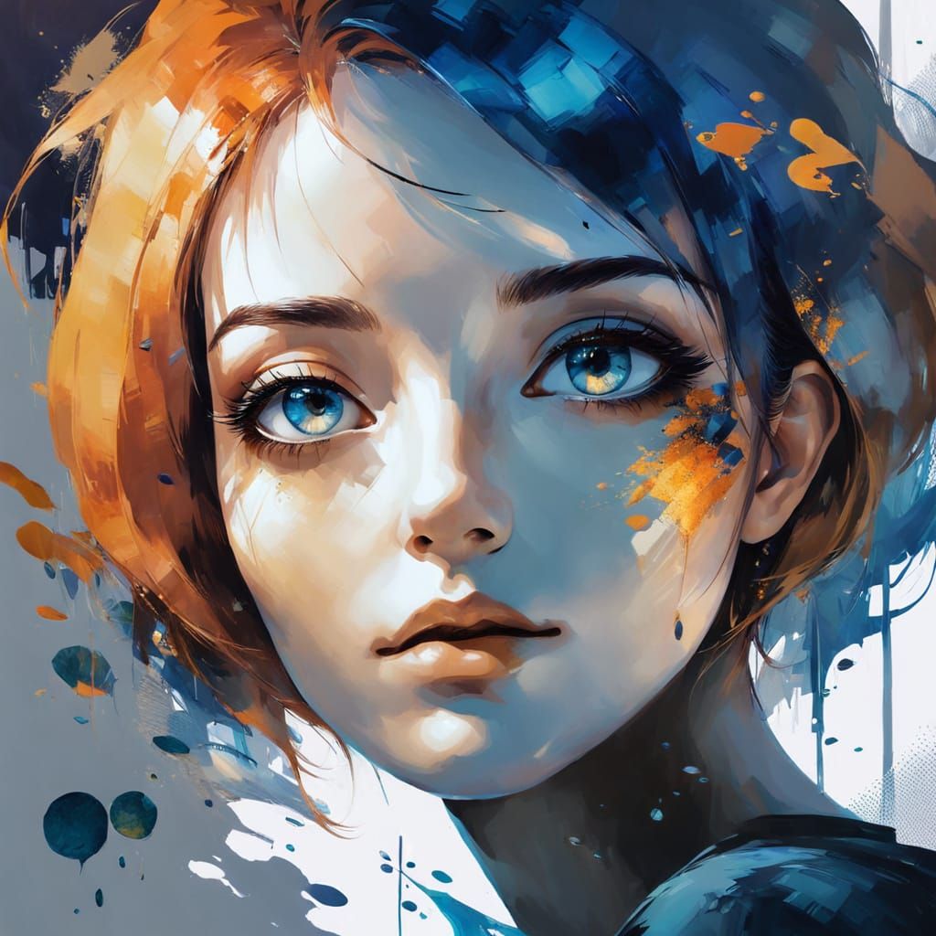 This image shows a stunning portrait of a young woman with short black hair and captivating glassy eyes. Created in a digital art style with a focus on realism.