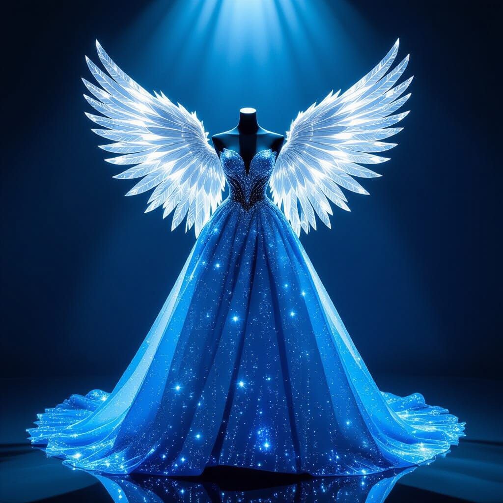A strapless blue crystal ball gown with white crystal wings, presented on a mannequin. Features a radiant, light-catching sparkle with neo-baroque and fantasy influences.