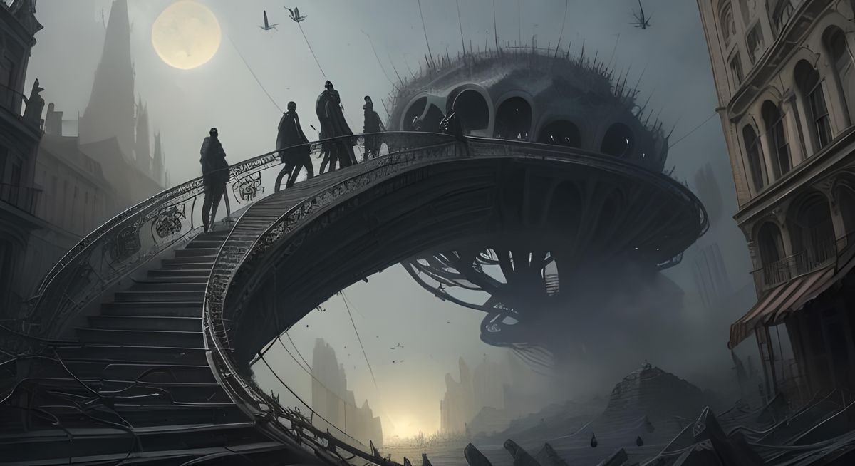 A gothic horror image of impossible staircases suspended above a city, leading into a vast spiderweb. The artwork evokes dark engravings and dramatic fantasy paintings.