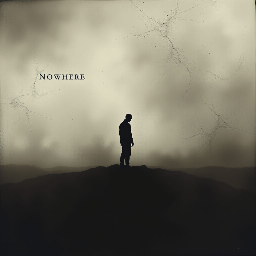 A desolate scene shows a silhouetted figure partially hidden by dust and shadows. The image uses a muted color palette and textures to evoke a sense of loneliness and mystery in a mixed media style.