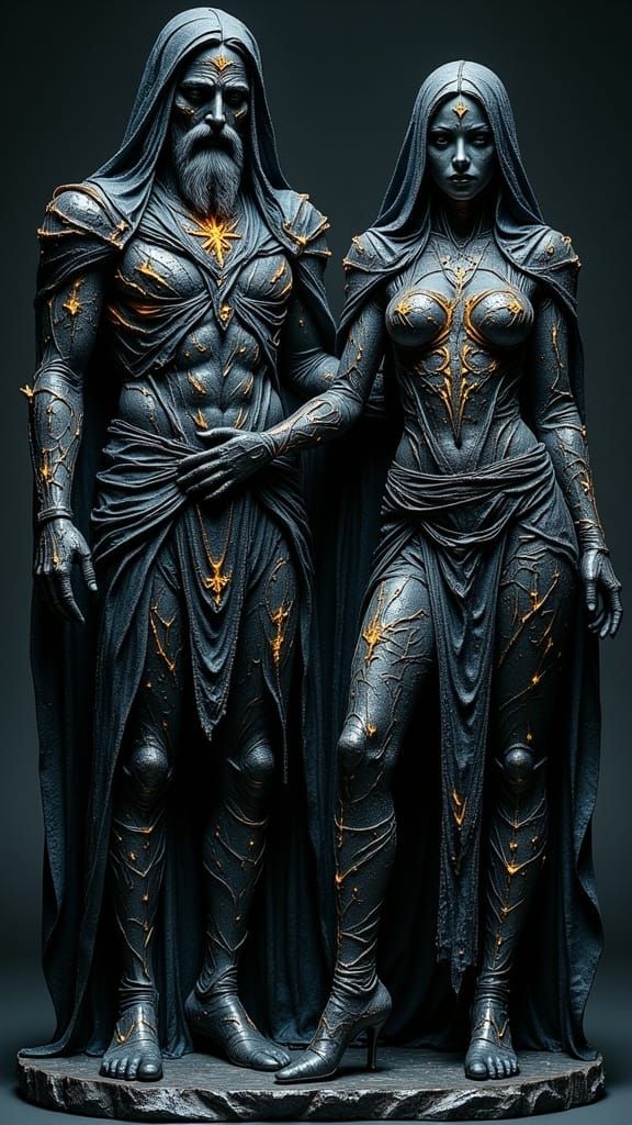 Sculpture of the ancient lord Jesus Christ and Mary Magdalene, adorned in ethereal, bioluminescent tattooed spells and sigils