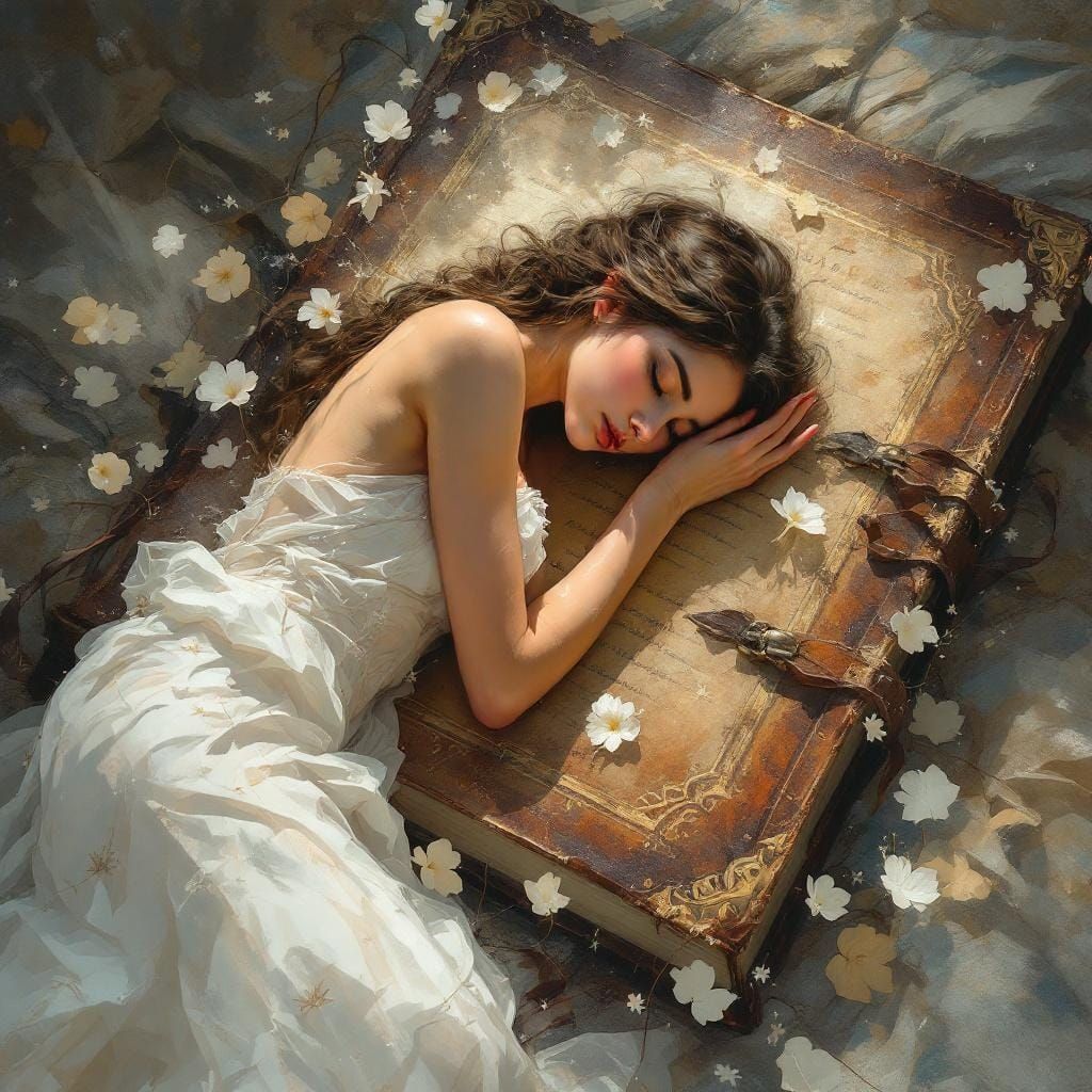 A surreal image of a woman in a white gown asleep on a spellbook. Ethereal light radiates from her body in gentle waves, rendered with impressionistic brushstrokes.
