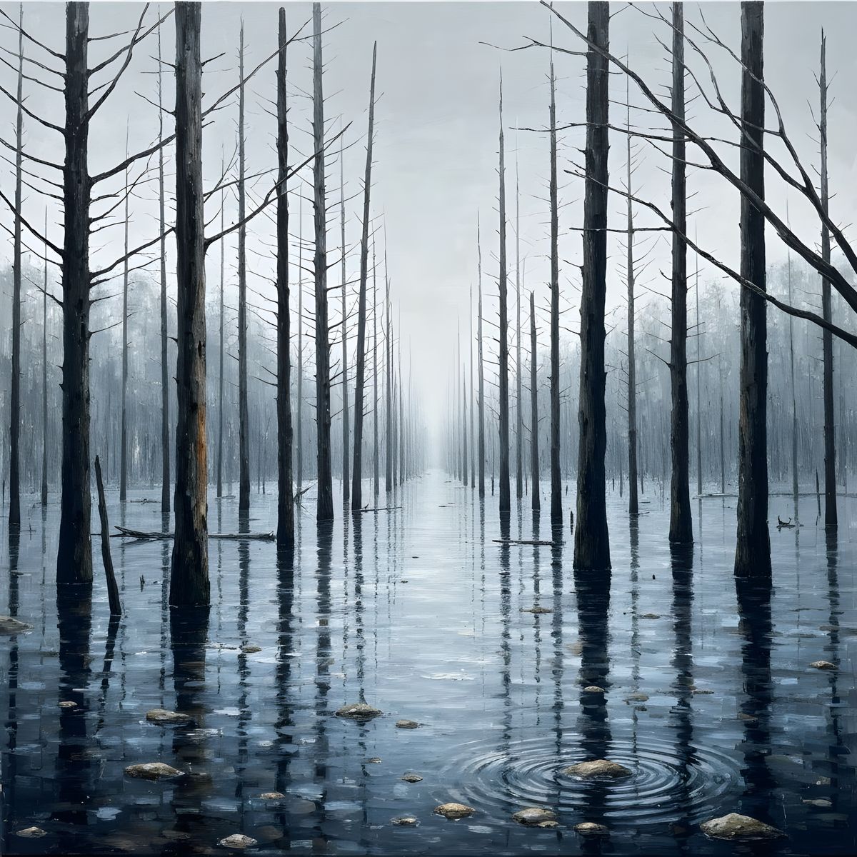 A somber landscape painting shows a submerged forest path lined with dead trees. This painterly work uses a muted palette and atmospheric perspective to evoke a sense of loss.