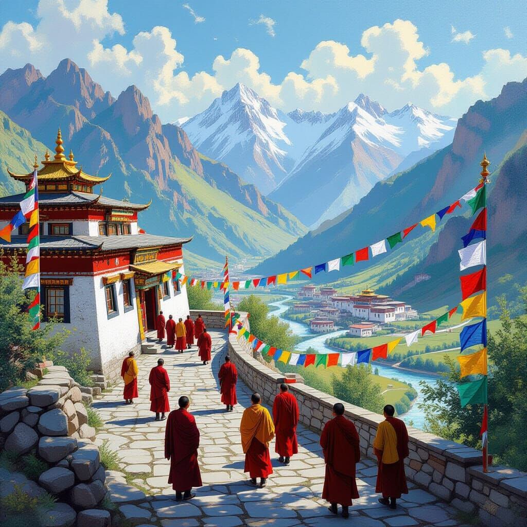 This image shows a Buddhist academy in a peaceful Tibetan valley. Monks in traditional robes are seen among prayer flags with a dreamy, symbolic landscape in vibrant colors, as an artistic rendering.