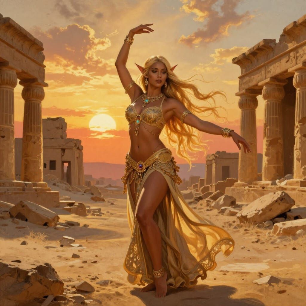 A striking image of a dark elf in a desert belly dance costume, gracefully dancing among ancient ruins at sunset. Rendered in a painterly, Art Nouveau style with flowing lines.
