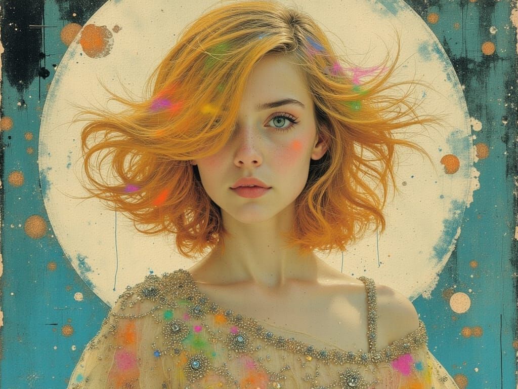 A young woman radiates confidence and playfulness in a flowing, beaded flapper dress, surrounded by a soft blue halo and vibrant, shimmering colors. The scene blends Art Deco patterns with classic Hollywood glamour, evoking the jazz age and a sense of mischievous charm.