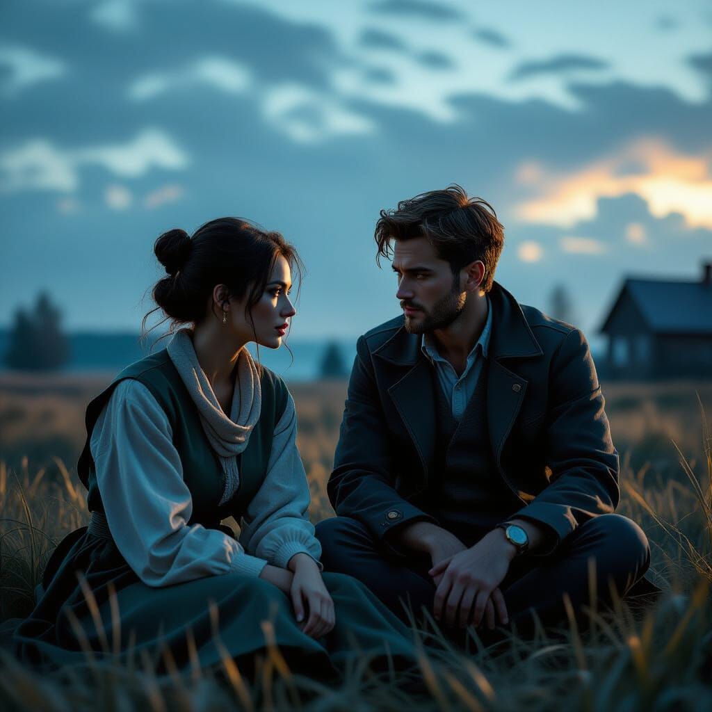 This image shows a woman and a man in deep thought, bathed in dramatic lighting with strong contrasts. The cinematic composition and emotionally charged atmosphere create a photorealistic scene with subtle textures.