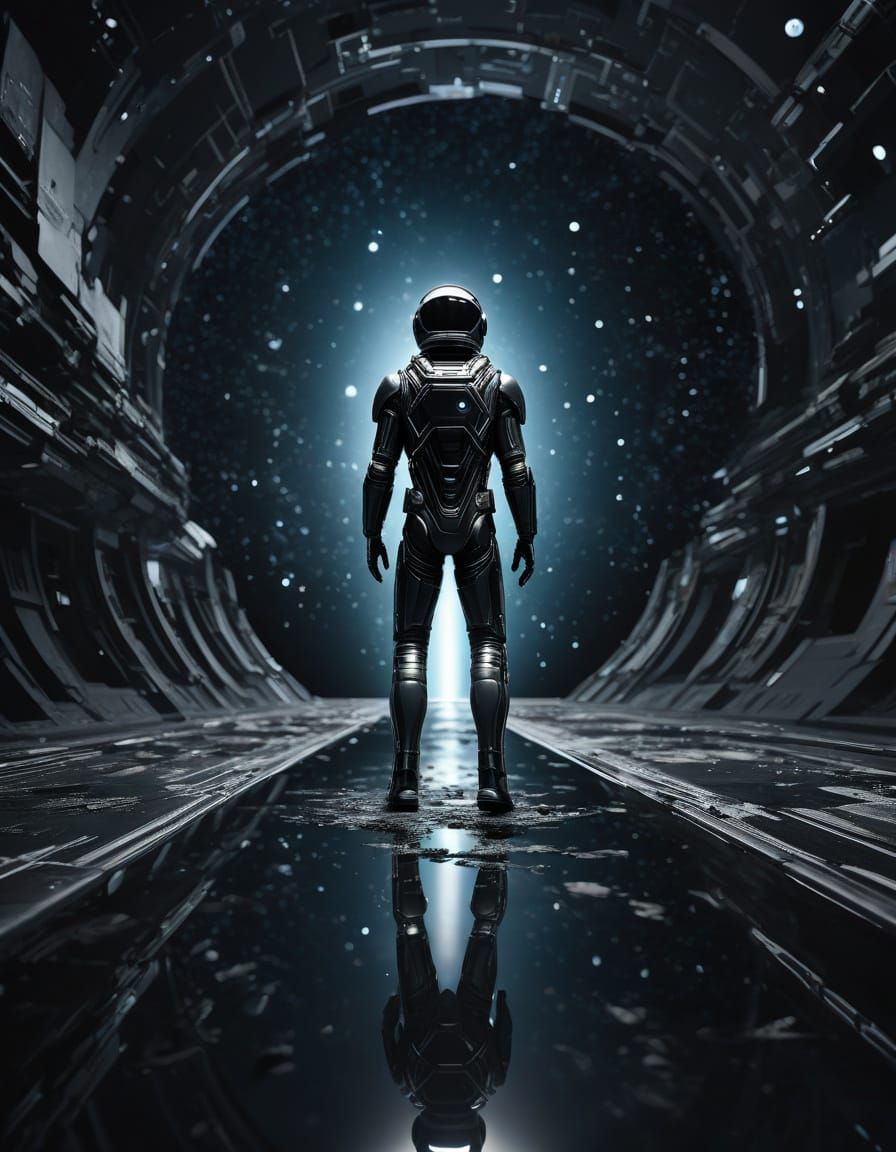 This image shows a glossy porcelain humanoid figure walking towards a black hole. The figure is crossing a reflective obsidian bridge stretching from Earth into space. The scene features cosmic light, warped stars, and gravitational lensing in UHD quality.