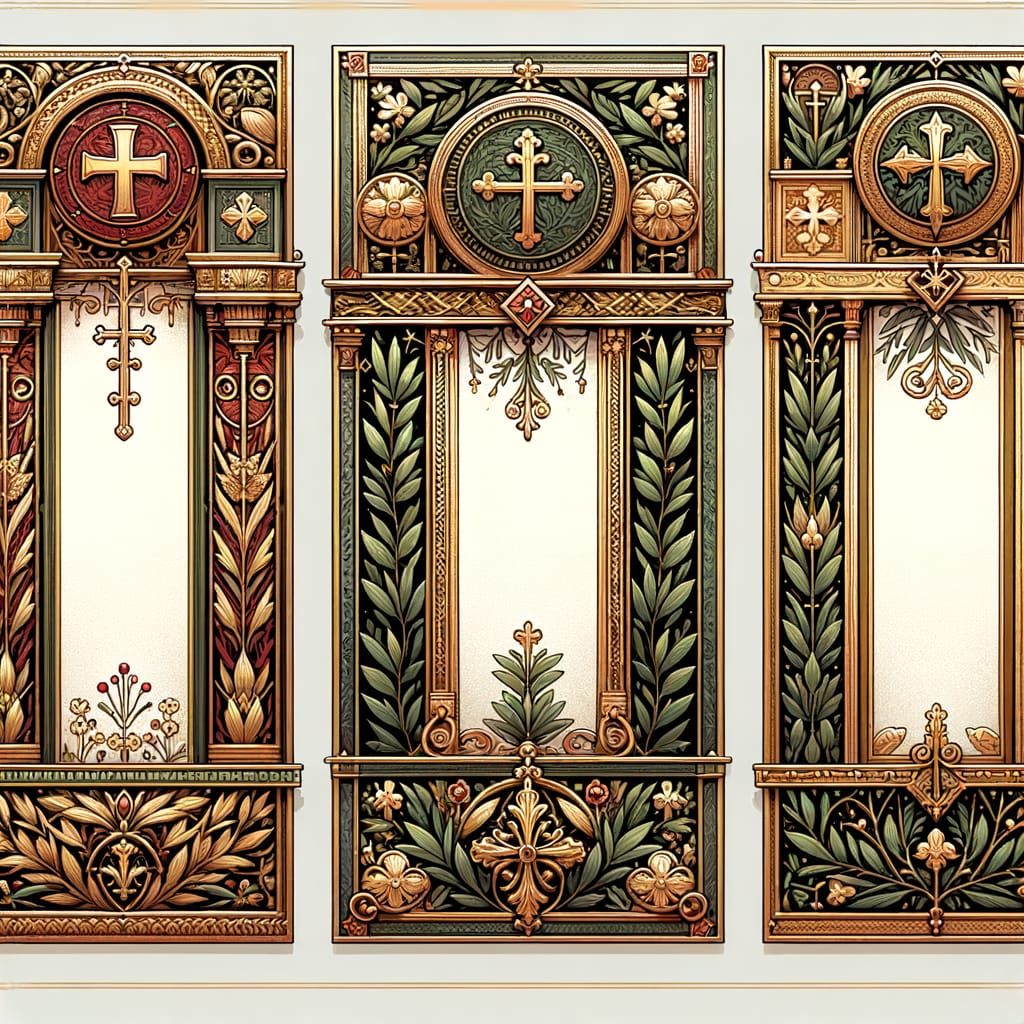 This image showcases three distinct vector frames: Byzantine with gold-red, nature-inspired with olive branches, and antique parchment with swirls. Designed for print, they feature intricate fantasy art details.