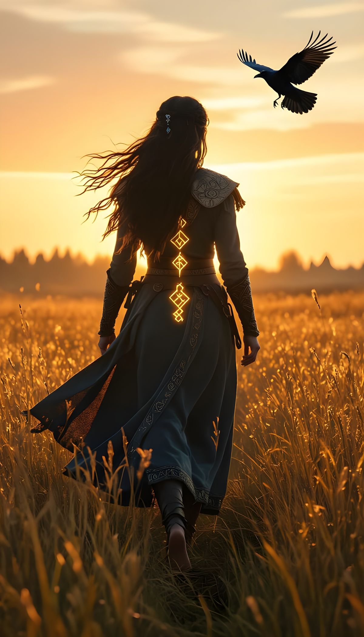 A serene image of a shieldmaiden walking through a golden meadow at sunrise. Runes glow in the air as a raven flies overhead, all rendered in a realistic fantasy style.