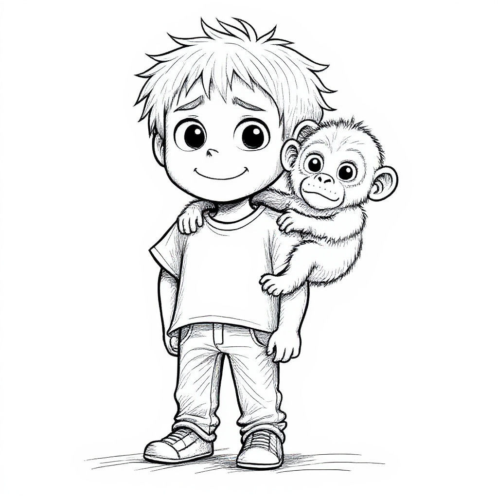 This image shows a simple black and white line drawing of a boy and monkey, designed in a cute comic style suitable for a children's coloring book. The illustration focuses on clean outlines and high contrast.