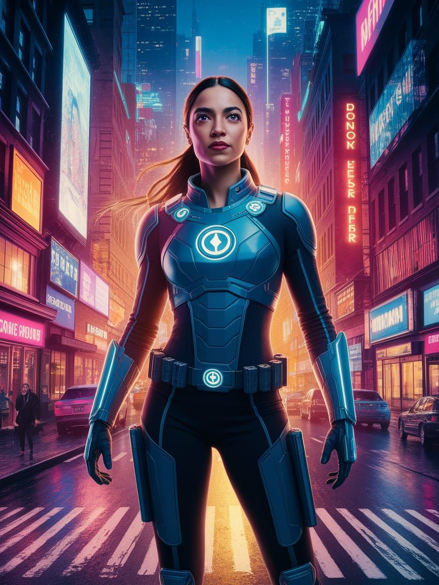 This image depicts a powerful female figure standing as a beacon of hope in a neon-lit cityscape, clad in high-tech armor adorned with symbols of social justice. The vibrant glow of holographic advertisements and the bustling urban environment create a captivating scene, highlighting her determined stanc...