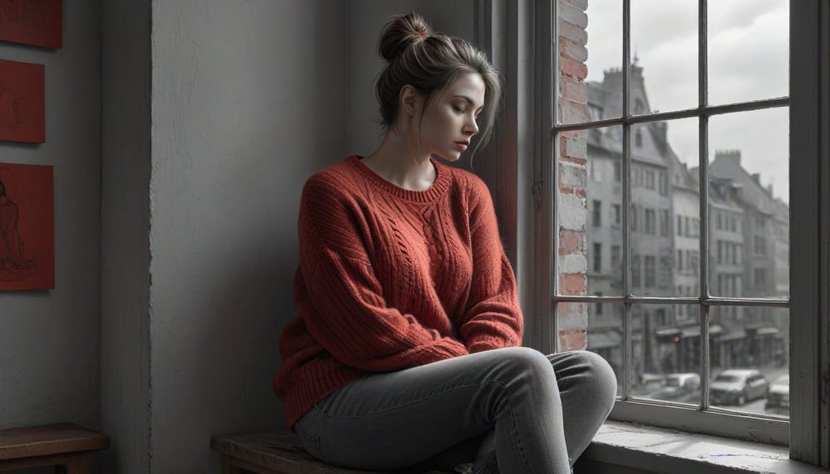 This image is a grayscale pencil sketch of a woman with a messy bun, wearing a cable-knit sweater and jeans, sitting by a window with a melancholic expression. Subtle crimson accents add depth to the scene.