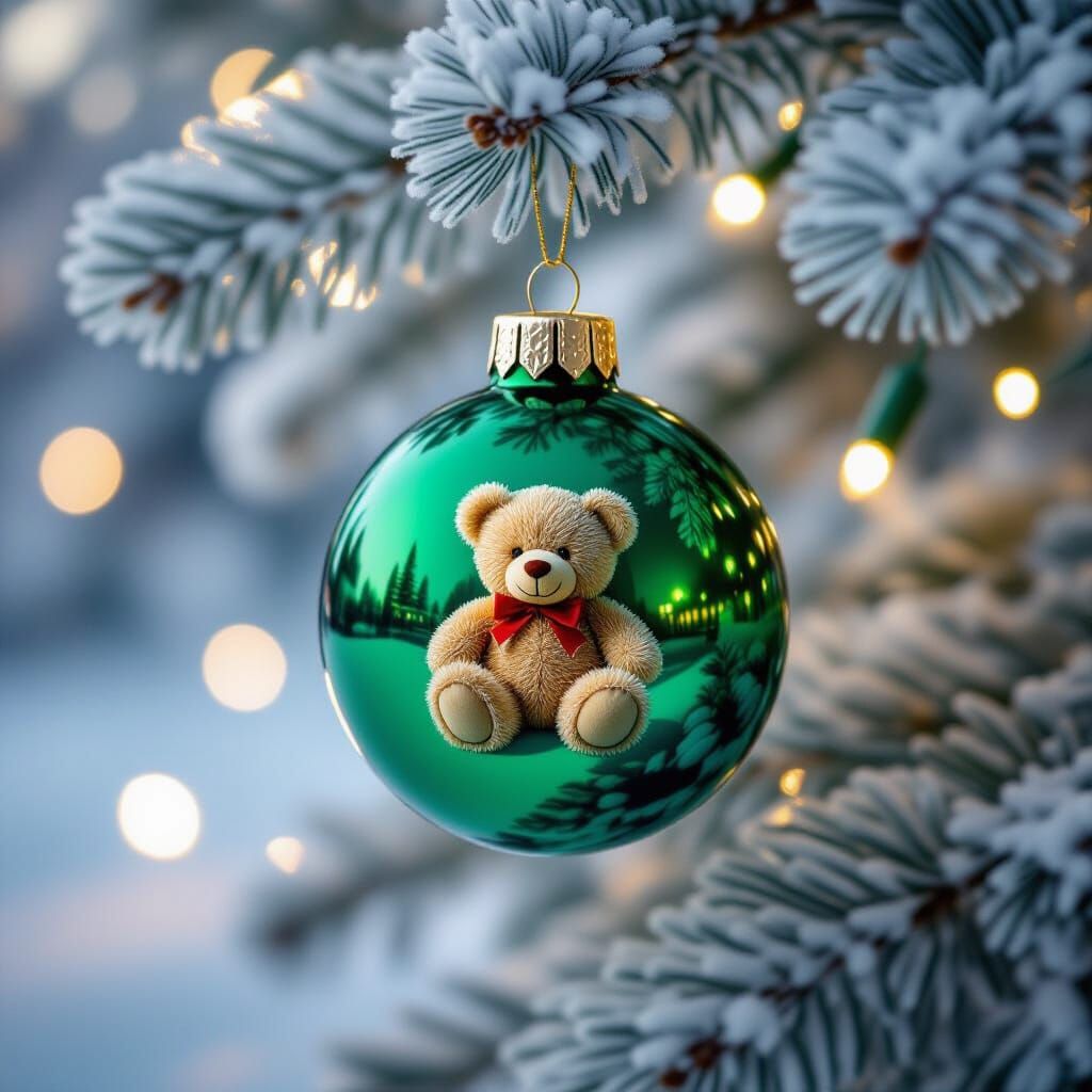 This hyper-realistic image shows a shiny green Christmas bauble on a frosted pine branch, reflecting a distorted teddy bear. A cozy holiday scene with soft light and snow.