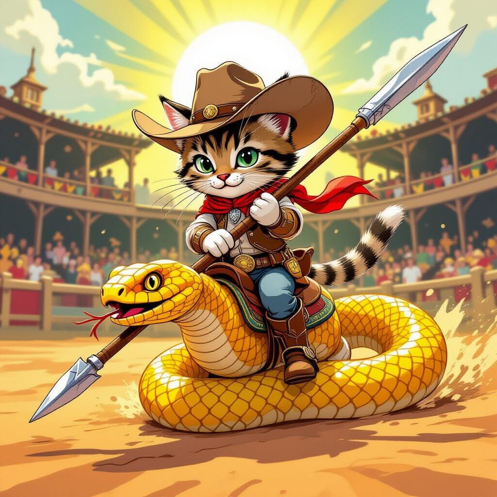 This image shows an anthropomorphic kitten in a cowboy hat, riding a yellow snake while holding a pike. Rendered in a bold, adventurous comic book style with dynamic lines and earthy colors.