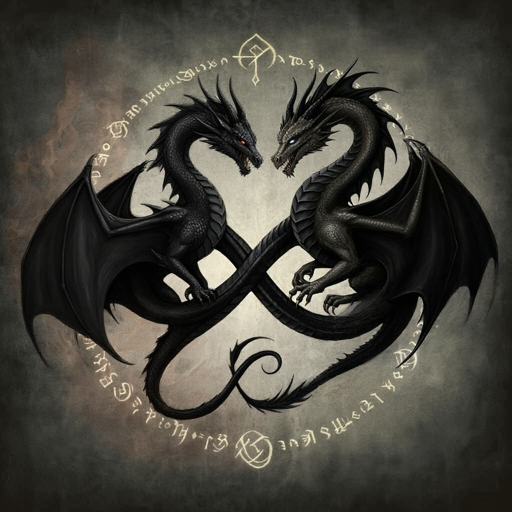 This image shows two intricately detailed dragons, one white and fiery, the other dark and mist-like, encircling an infinity symbol. Mystical runes add to the dark fantasy aesthetic.