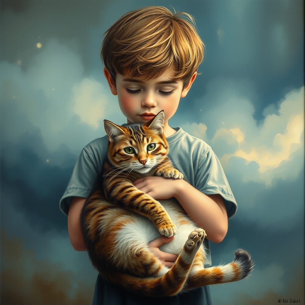 A detailed charcoal drawing of a boy holding a cat in a serene, misty atmosphere. The artwork is reminiscent of fantasy art, with gouache and watercolor textures and thick brush strokes.