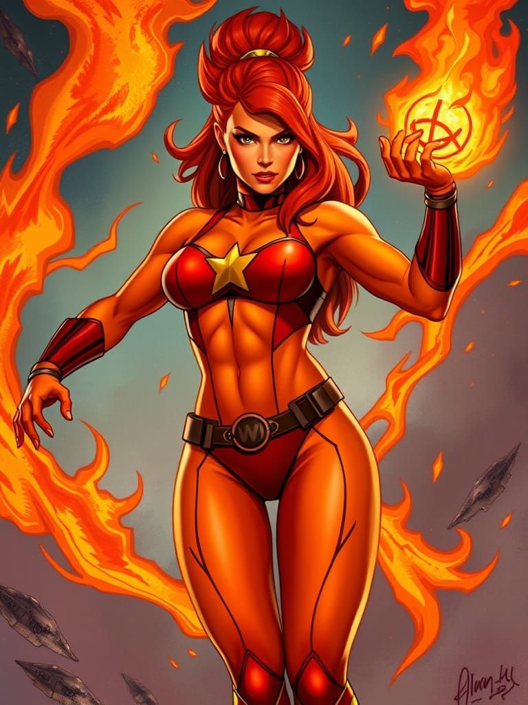 A vibrant image of Starfire, an athletic alien princess superheroine. Her striking orange skin and flaming red hair are presented with bold lines, dynamic textures, and a vibrant color palette.