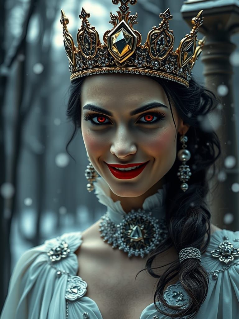 This image shows a regal vampire queen in a white gown and jeweled crown, smiling evilly with piercing red eyes. Set in a moody, snowy winter forest with dramatic lighting.