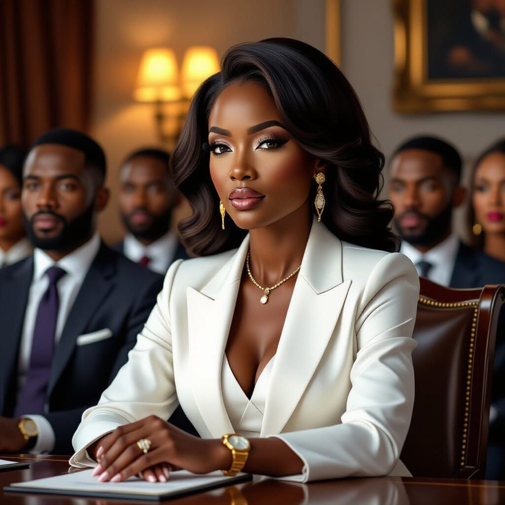 A hyperrealistic digital painting of a determined Nigerian billionaire woman with lawyers. Dramatic lighting highlights her unreadable but resolute expression, capturing a moment of silent observation in a warm color palette.