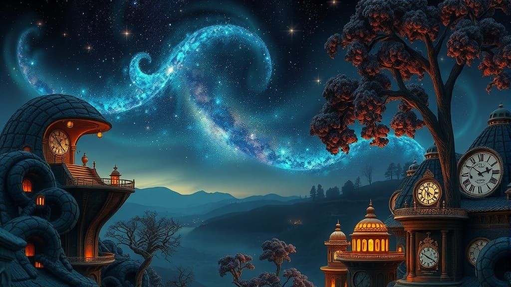 This enchanting image showcases a mystical night landscape with shimmering stars, intricate clockwork mechanisms, and ancient trees, all brought to life in a detailed matte painting style with rich, deep colors and intricate textures.