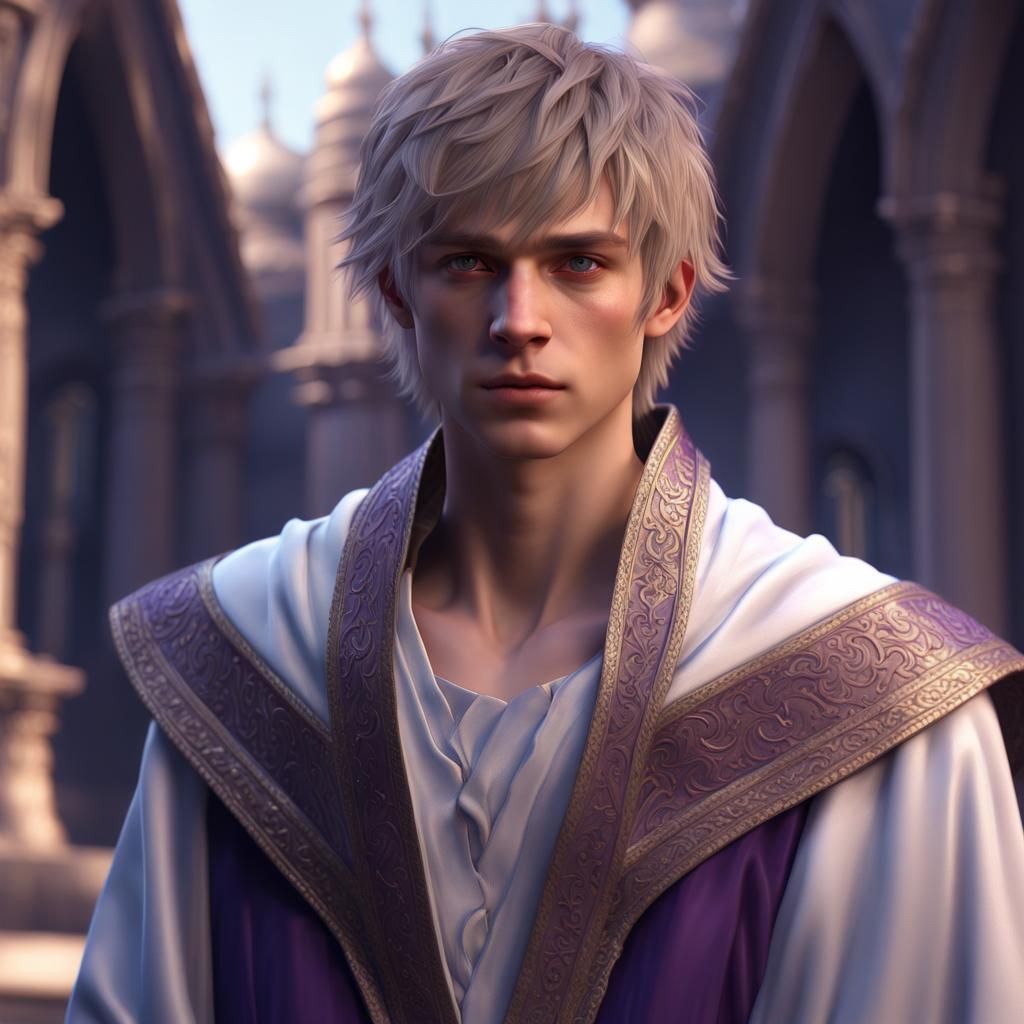 A photorealistic image of a beautiful young man with platinum hair, wearing a purple robe. This detailed digital artwork features volumetric lighting and 3D shading in a fantasy concept art style.