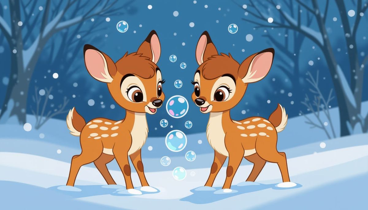 This image shows two cartoon deer cubs playing with bubbles in the snow. The image is reminiscent of classic Disney animation from the 1950s, rendered in 2D.