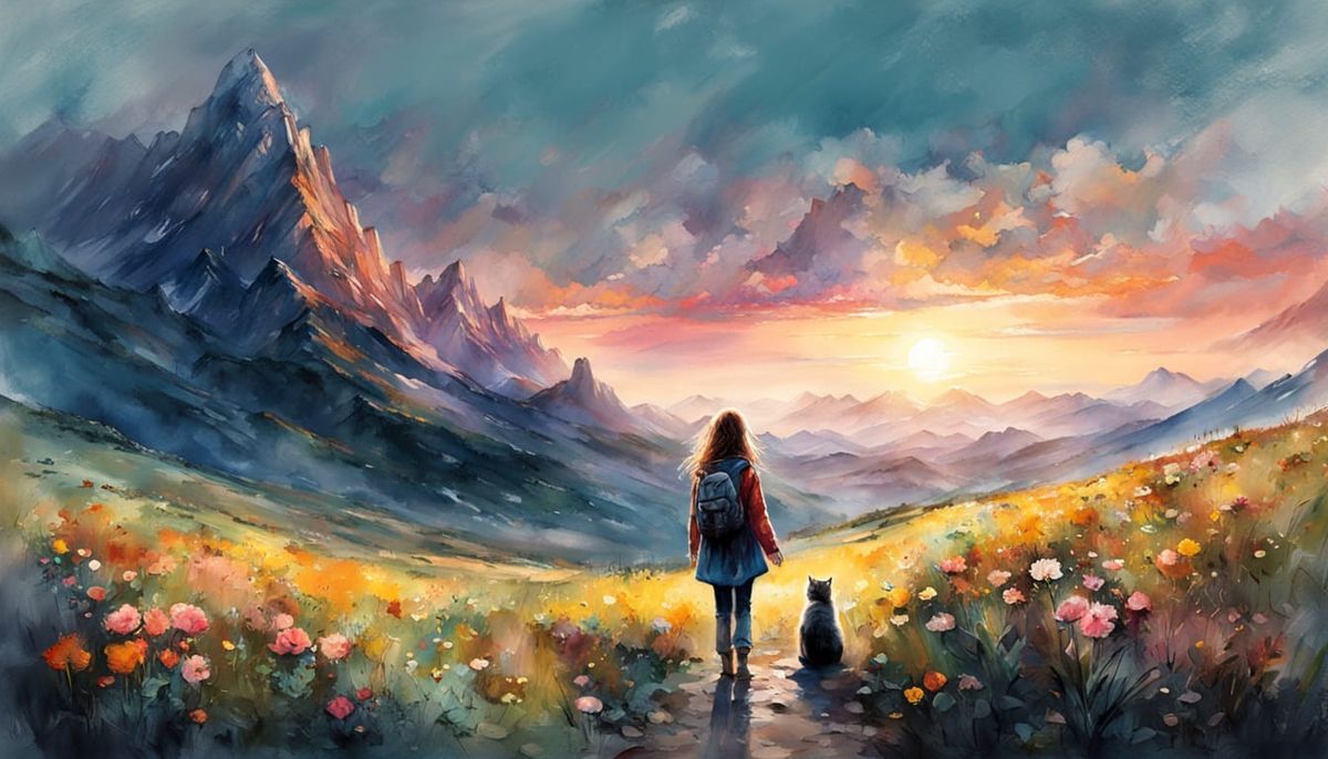This stunning watercolor painting depicts a charming girl and her cat amidst a lush meadow, surrounded by vibrant flowers and set against a brilliant blue sky with warm sunlight. The artwork features intricate textures and rough brushstrokes, creating a dramatic and beautiful fine art piece.