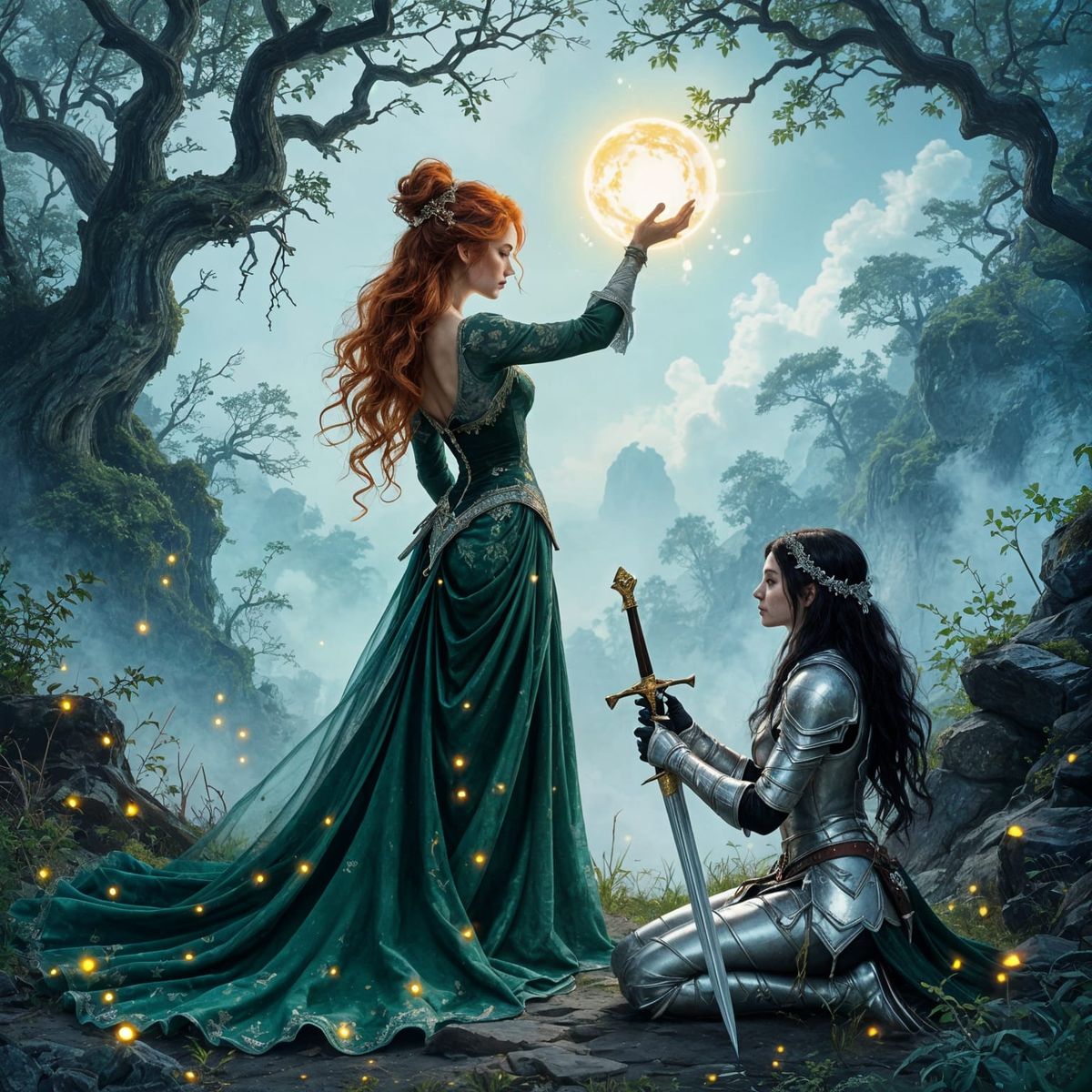 A fantasy scene of two women in a moonlit forest. One woman with red hair and an emerald gown holds a glowing orb while the other kneels before her offering a sword. The style evokes dark fantasy art with cinematic lighting.