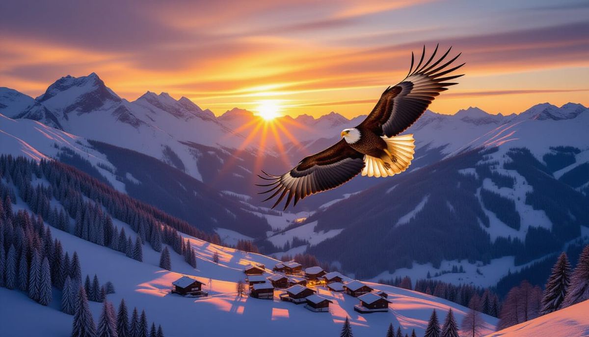 This image captures a majestic eagle flying above snow-capped Swiss Alps during a dramatic sunset. Realistic photography showcases cinematic lighting and a wide-angle view of a village below.