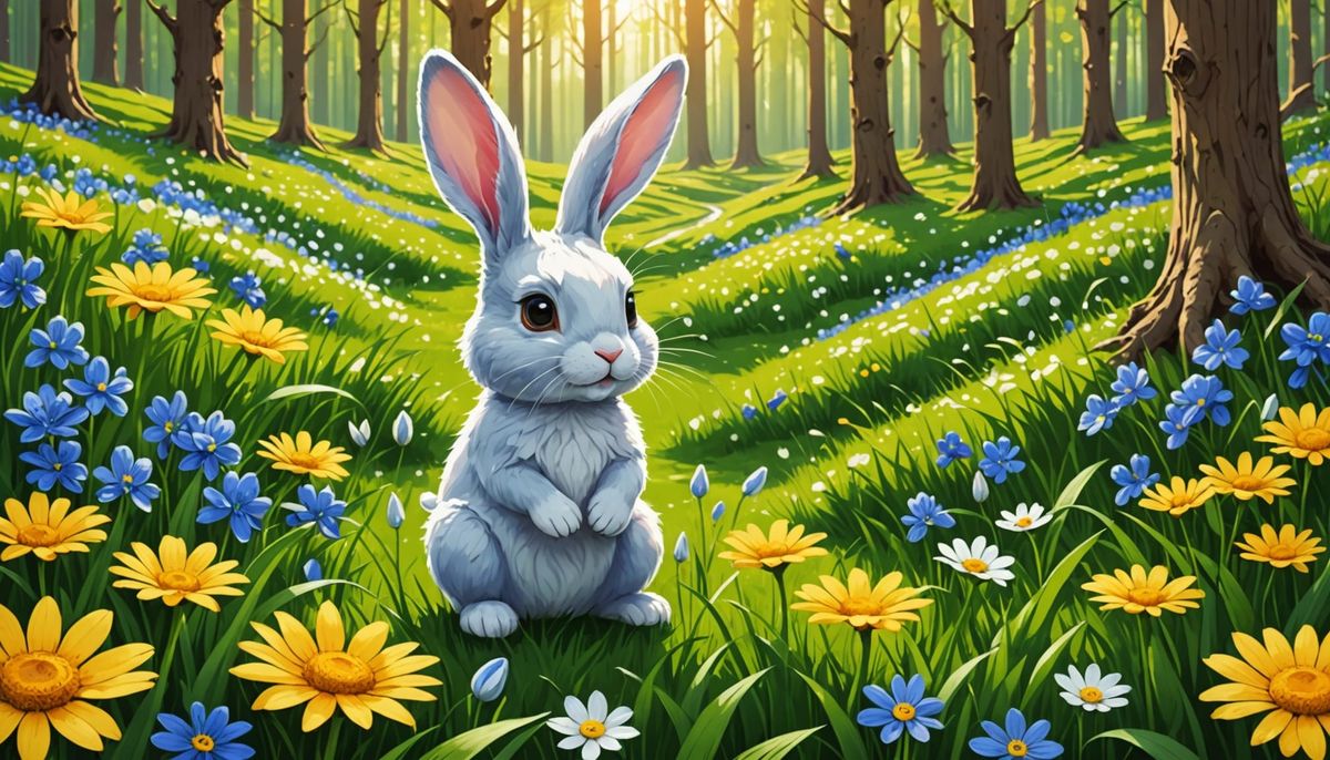 This image shows a bunny hopping through a vibrant woodland filled with flowers and berries. Rendered as 3D anime art, it features abstract fractal designs and intricate shading.