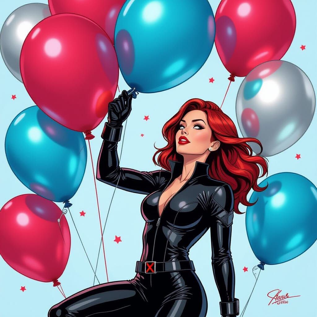 A stylized illustration of Black Widow in a black suit, surrounded by large red, blue, and silver balloons, playfully popping a birthday balloon. The illustration evokes dynamic comic art with bold colors.