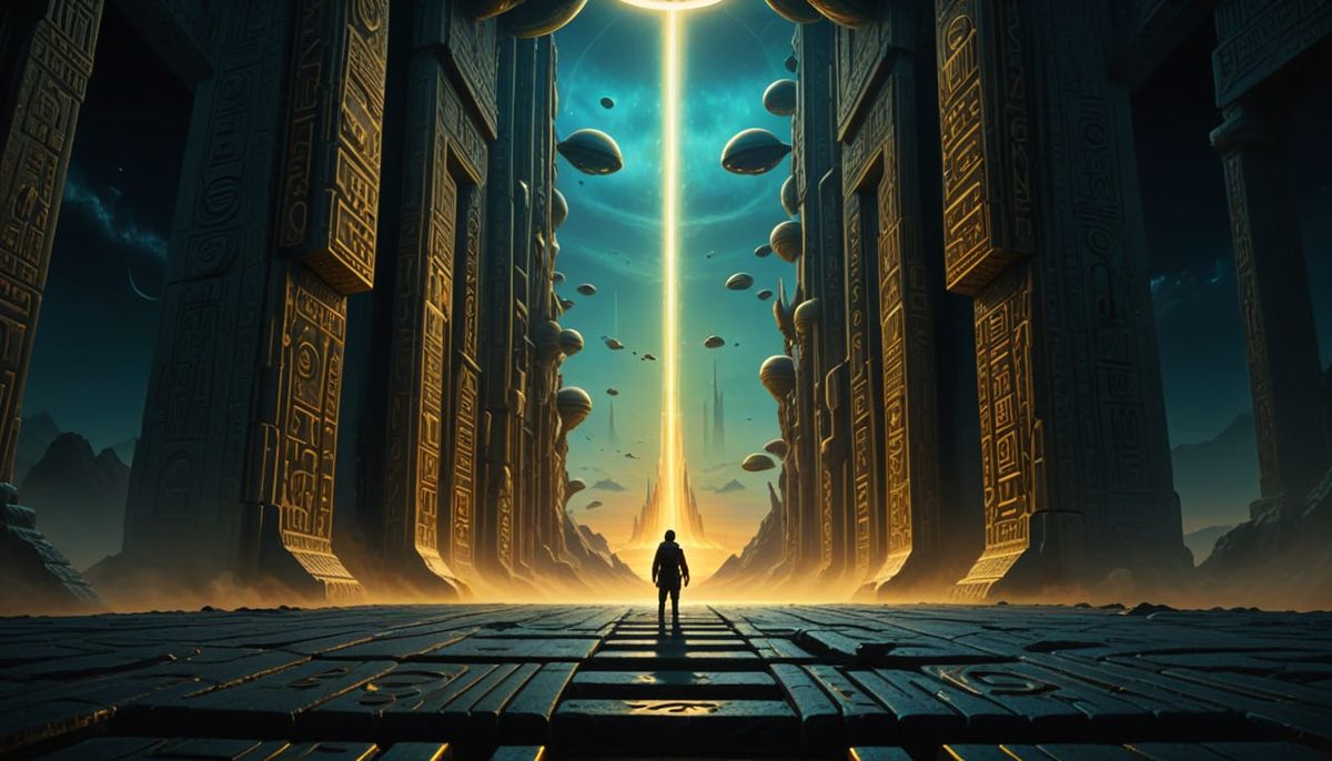 A close-up of alien inscriptions on towering, ancient structures. The image features a low-angle shot with golden sunset lighting, creating a hyper-realistic science fiction illustration with vibrant colors.