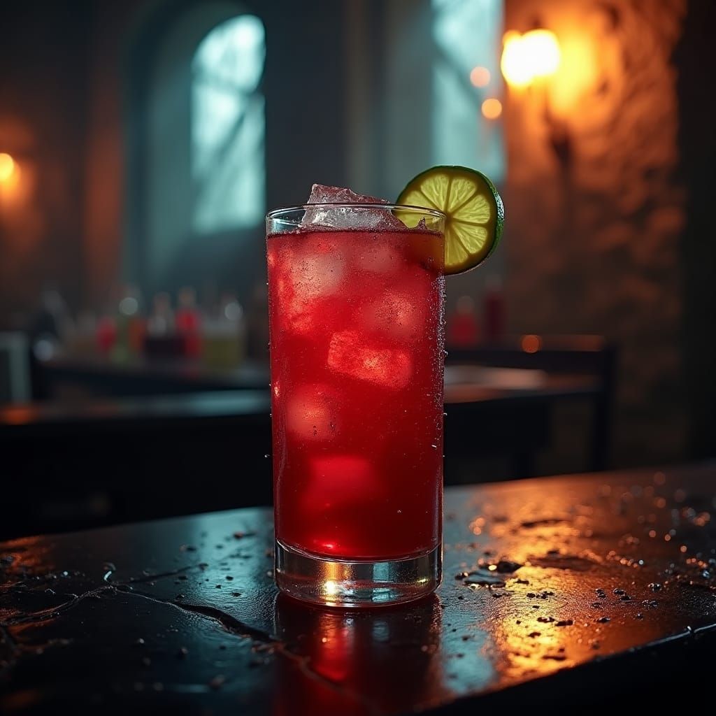 This image shows a bright red cocktail in a tall glass on a dimly lit bar. The background evokes a gothic noir aesthetic with castle walls, cobwebs, and dramatic lighting.